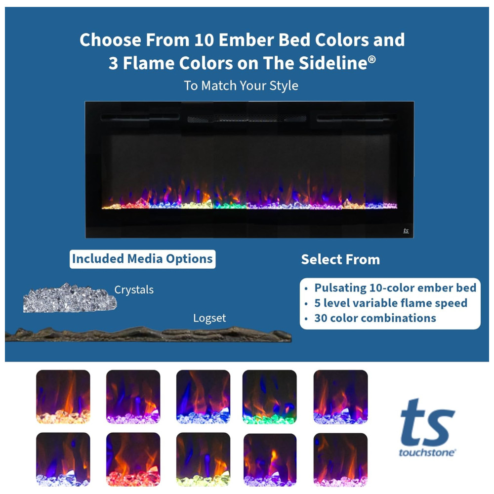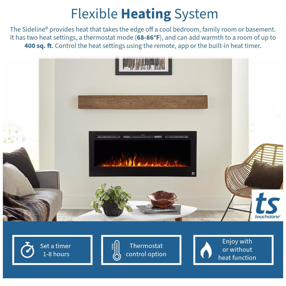 Apresentando a Lareira Elétrica Inteligente Touchstone Sideline de 213 cm APARÊNCIA A lareira elétrica Sideline foi projetada para ser embutida na parede, criando uma atmosfera aco