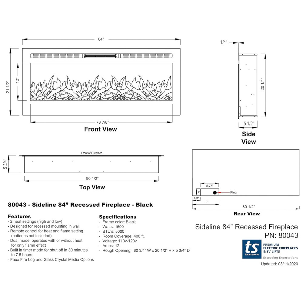 Lareira Elétrica 80043 de Embutir A53x213L com Controle Remoto e Chamas Multicolorida, 1500W, 110v, TOUCHSTONE, Preto