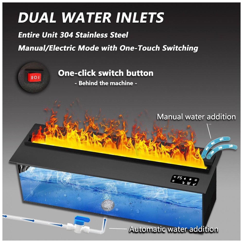 Inclui controle manual do nível de água para manutenção consistente da névoa e desempenho otimizado da chama simulada, além de controle remoto para ajuste da intensidade da chama e do efeito de nebulização com função dimmer.