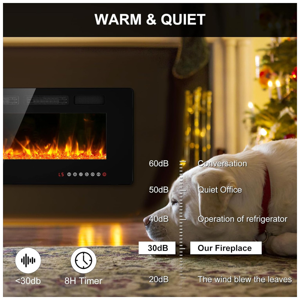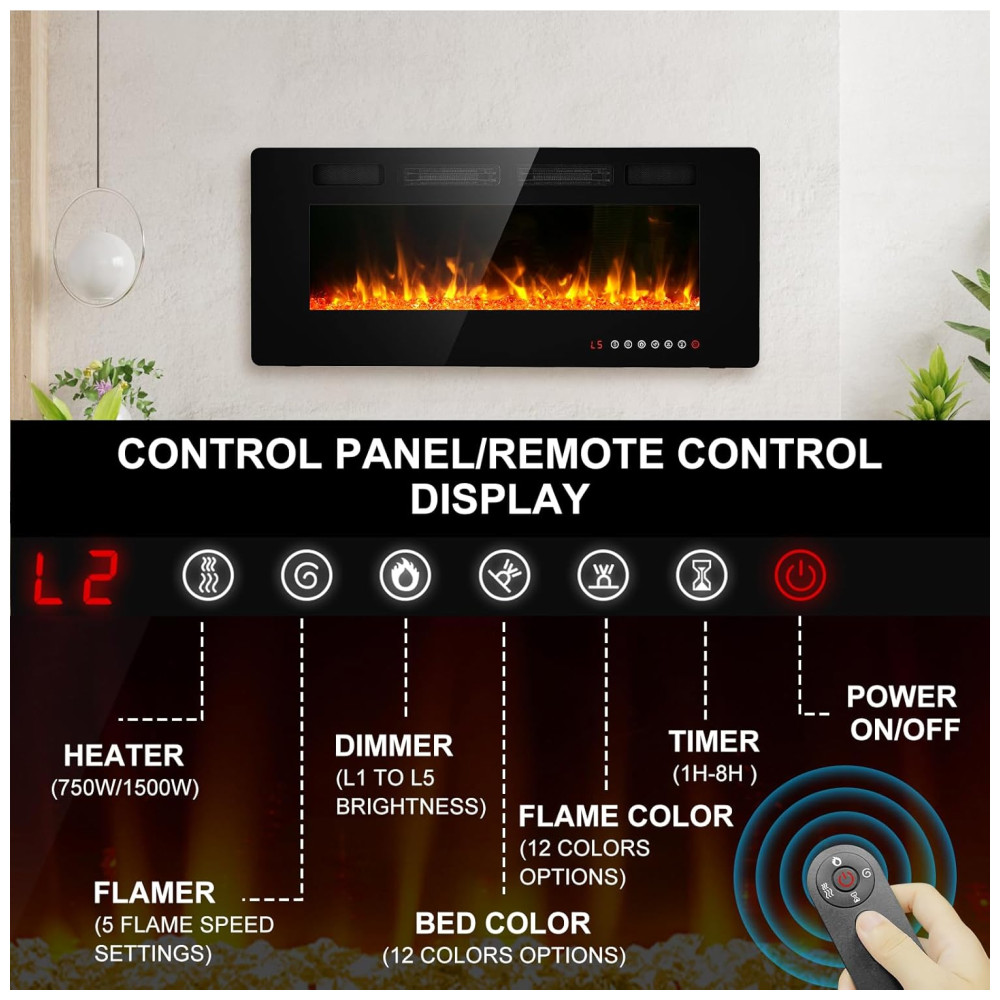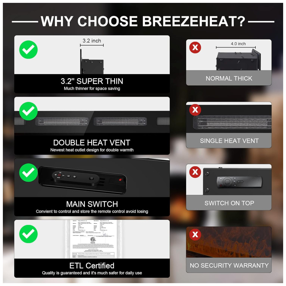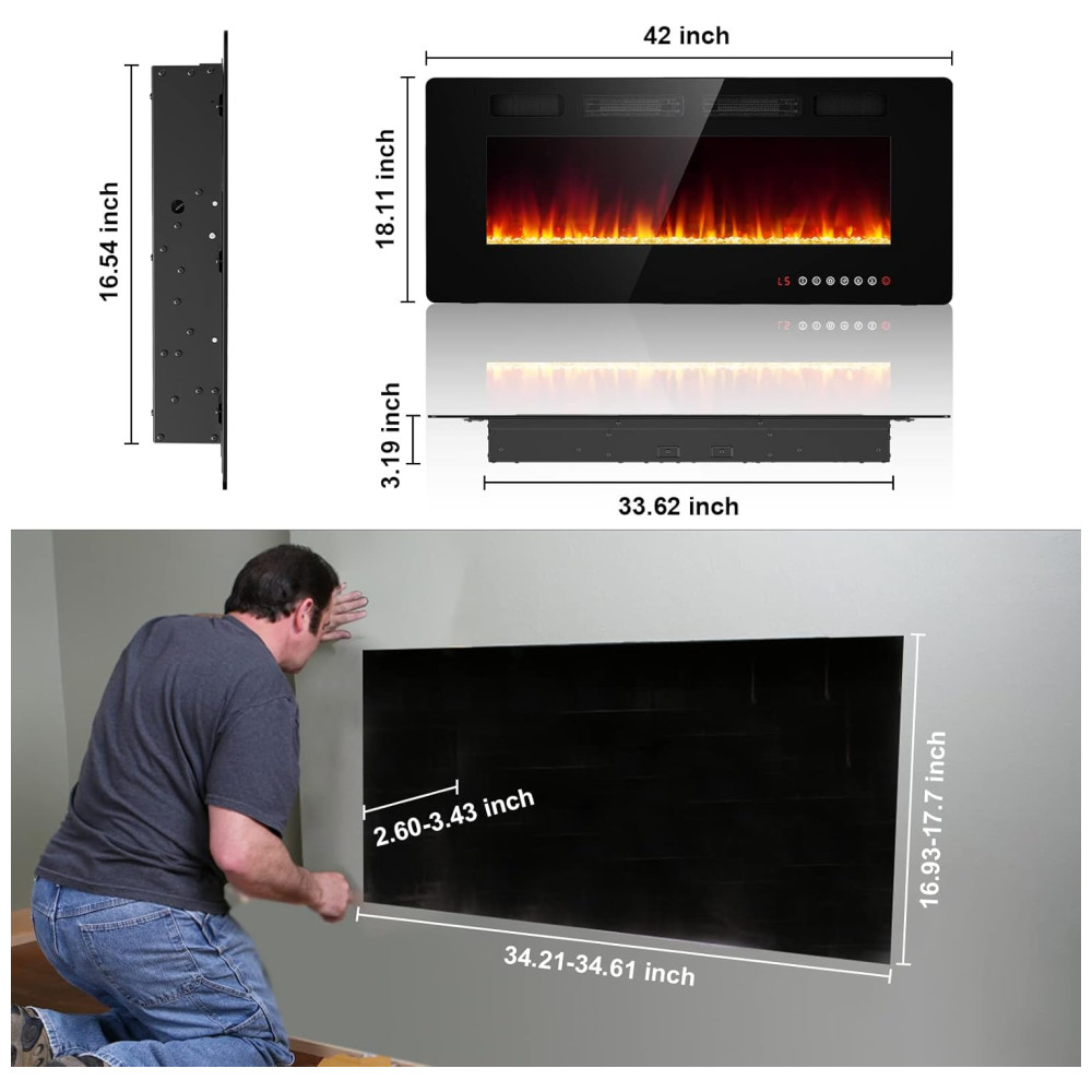 Lareira Elétrica BREEZEHEAT 107 cm Recessada, Montada na Parede, Aquecedor Ultra Fino, 2 Saídas de Calor, Controle Remoto, Tela Touch, Chama Ajustável: Esta lareira elétrica ultrafina, projetada pela Breezeheat, apresenta um design moderno e fino, com uma espessura de apenas 8,13 cm.