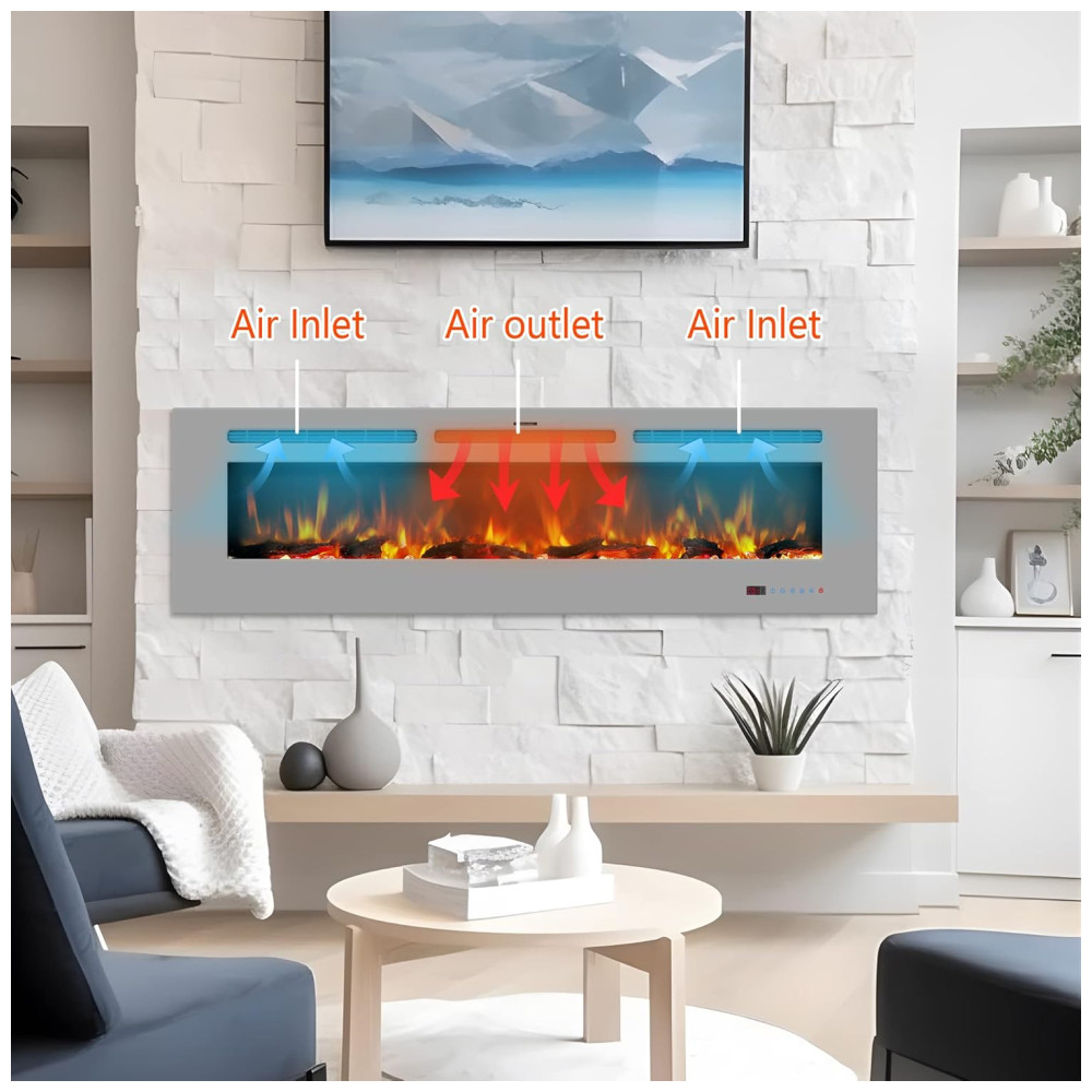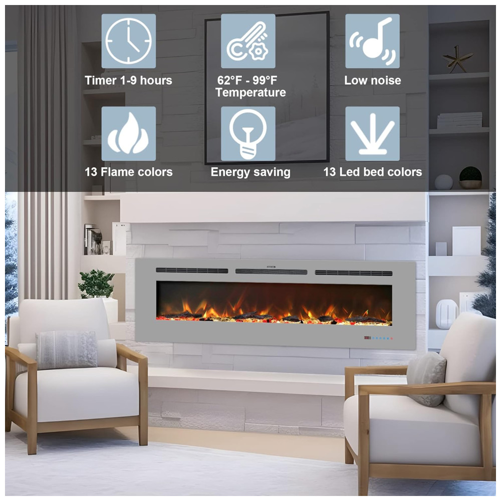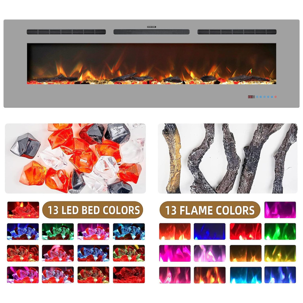 Lareira Elétrica de 152 cm, Embutida ou de Parede, Aquecedor Linear com Termostato,Tela Touch,Chama Multicolorida,Timer, Troncos e Cristais, Kentsky: Com 1313 cores de chama e leito, este aquecedor de lareira elétrica permite ajustar as cores da chama do leito de combustível LED para combinar com diferentes ambientes e atmosferas, além de vir com toras e cristais para DIY, criando uma cena mais realista.