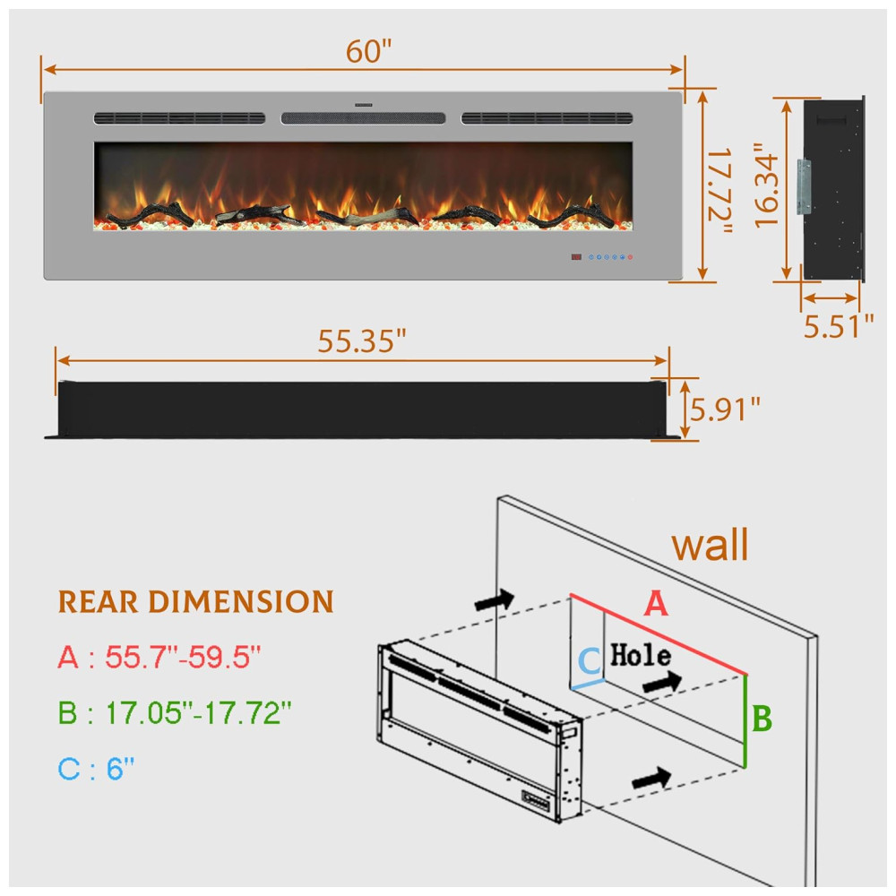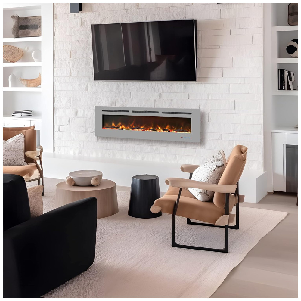 Lareira Elétrica de 152 cm, Embutida ou de Parede, Aquecedor Linear com Termostato,Tela Touch,Chama Multicolorida,Timer, Troncos e Cristais, Kentsky