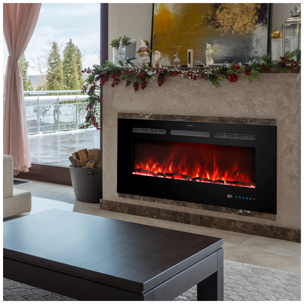 Instalação Embutida e Montada na Parede Esta lareira linear preta pode ser embutida na parede ou pendurada na parede sem ocupar muito espaço.