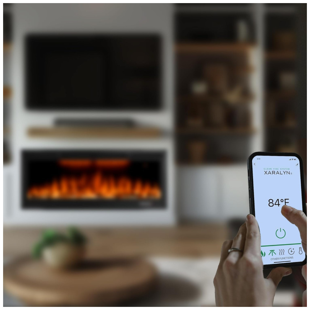 Conheça a Lareira Elétrica Embutida de 158 cm com Controle via APP Controle Inteligente via APP Use o aplicativo XARALYN para alternar as funções da lareira.