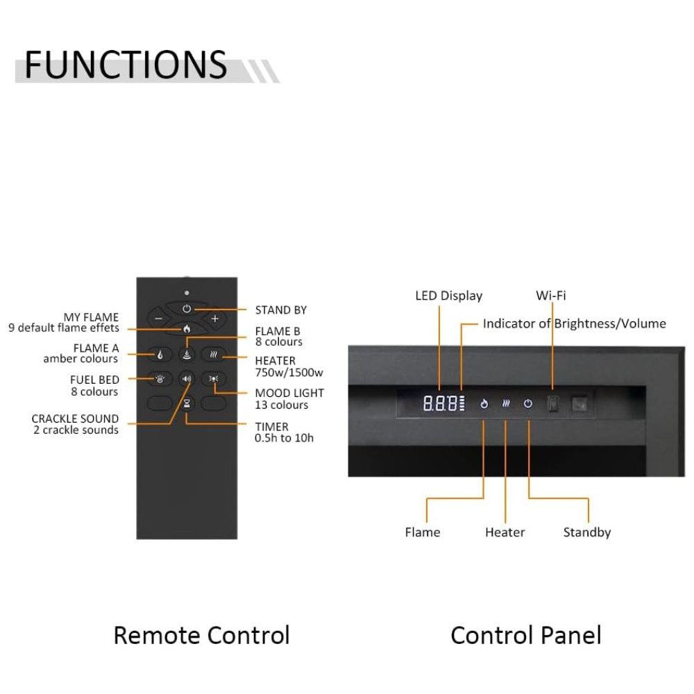 Chama multicolorida e cama de combustível em 5 configurações de brilho, sons crepitantes para se adequar aos seus diferentes humores alegres ou pacíficos em diferentes ocasiões.