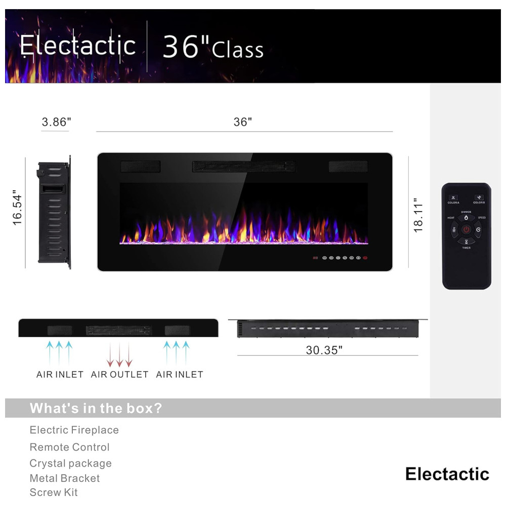Lareira Elétrica de Embutir A45x106L com Controle Remoto e Digital, Luz LED, Chama Ajustável e Temporizador, 1500W, 110v, ELECTACTIC 842C3, Preto