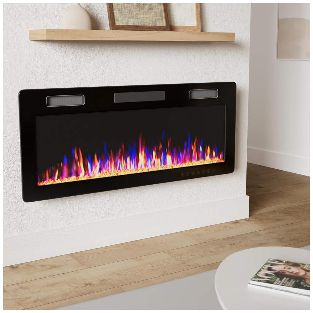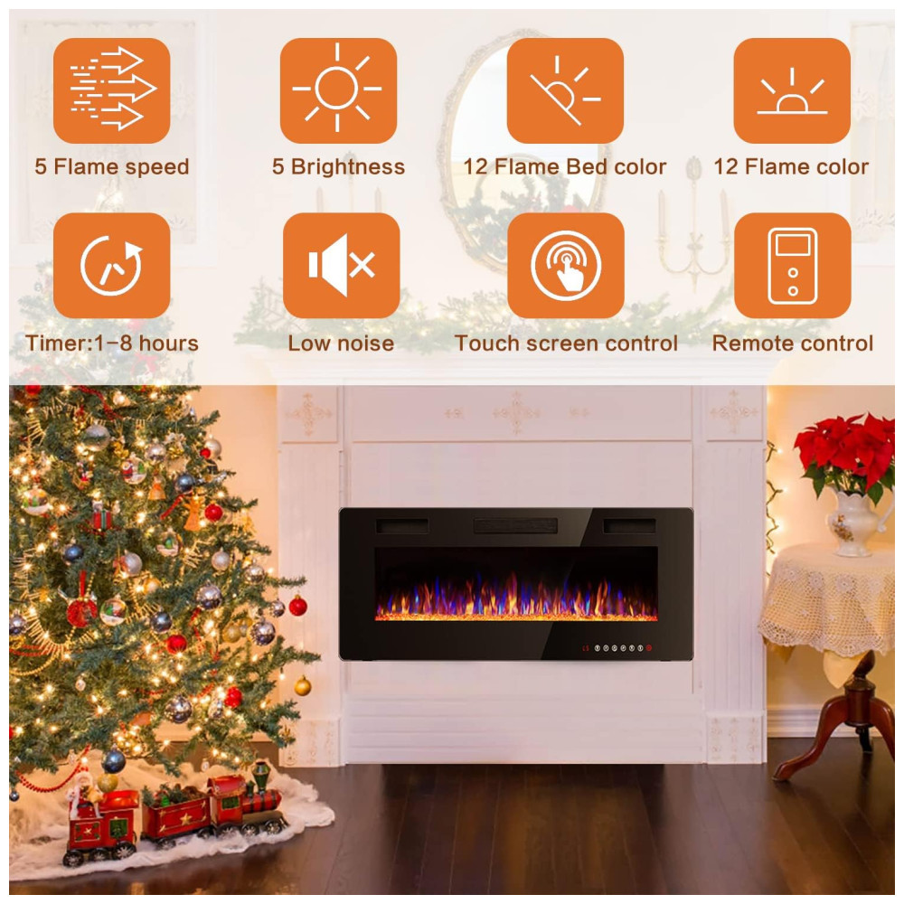 Luzes LED de ultra alta intensidade com visor grande permitem que a chama mostre uma queima alta o suficiente, as chamas emergem lentamente da fonte e depois são puxadas para o topo da lareira, onde piscam no calor da parte superior da lareira Multi Funções O controle remoto e a tela sensível ao toque tornam mais conveniente controlar todas as funções da lareira elétrica, interruptor de energia, controle do temporizador de 1 a 8 horas, interruptor independente de aquecimento e chama, cor e velocidade da chama ajustáveis, função de modo de suspensão