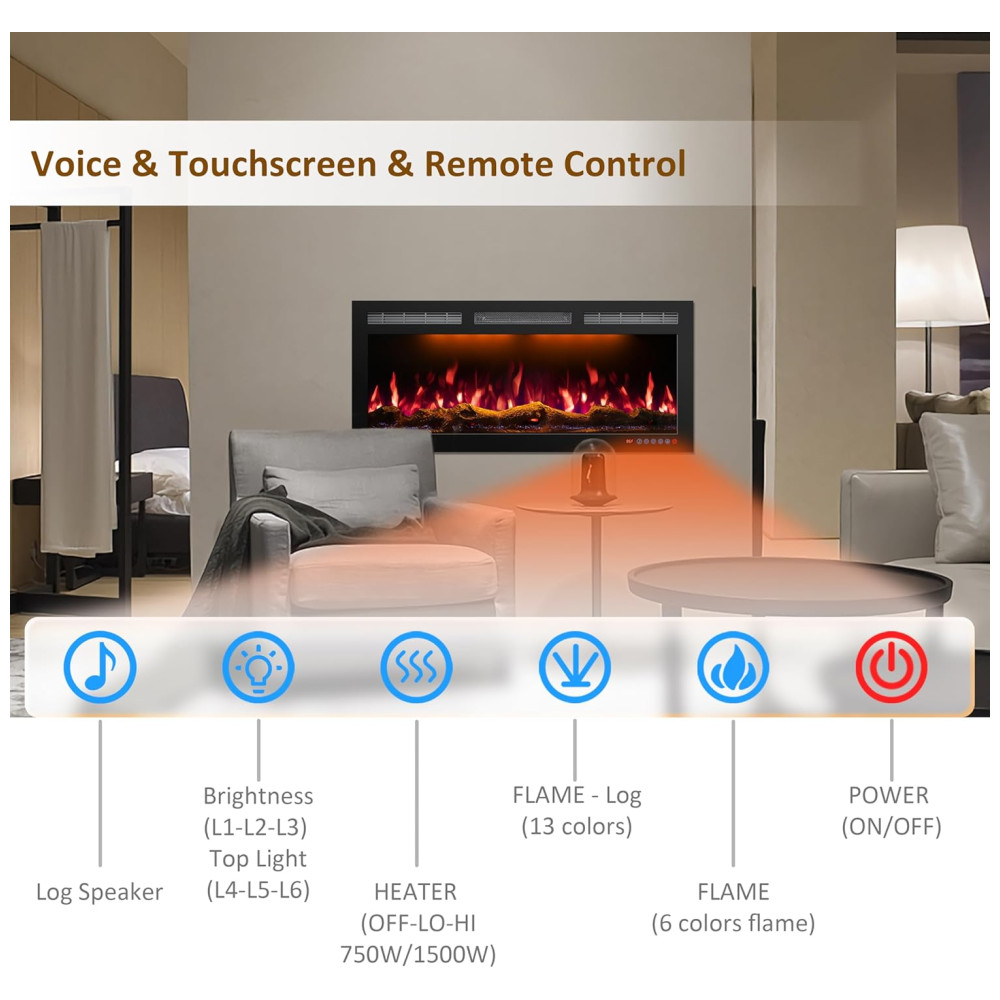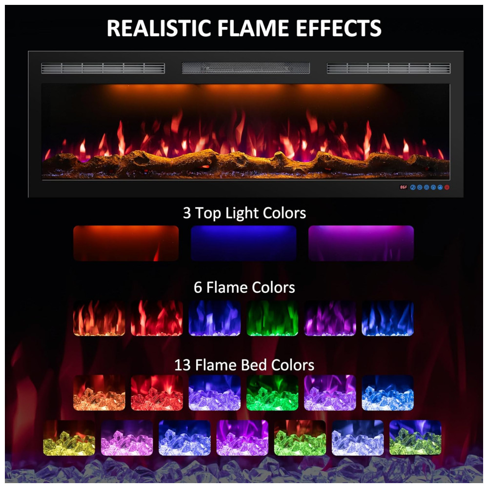 DIVERSAS FUNÇÕES Este aquecedor de lareira slim possui 3 luzes superiores, 6 cores de chama e 13 cores da base da chama disponíveis.