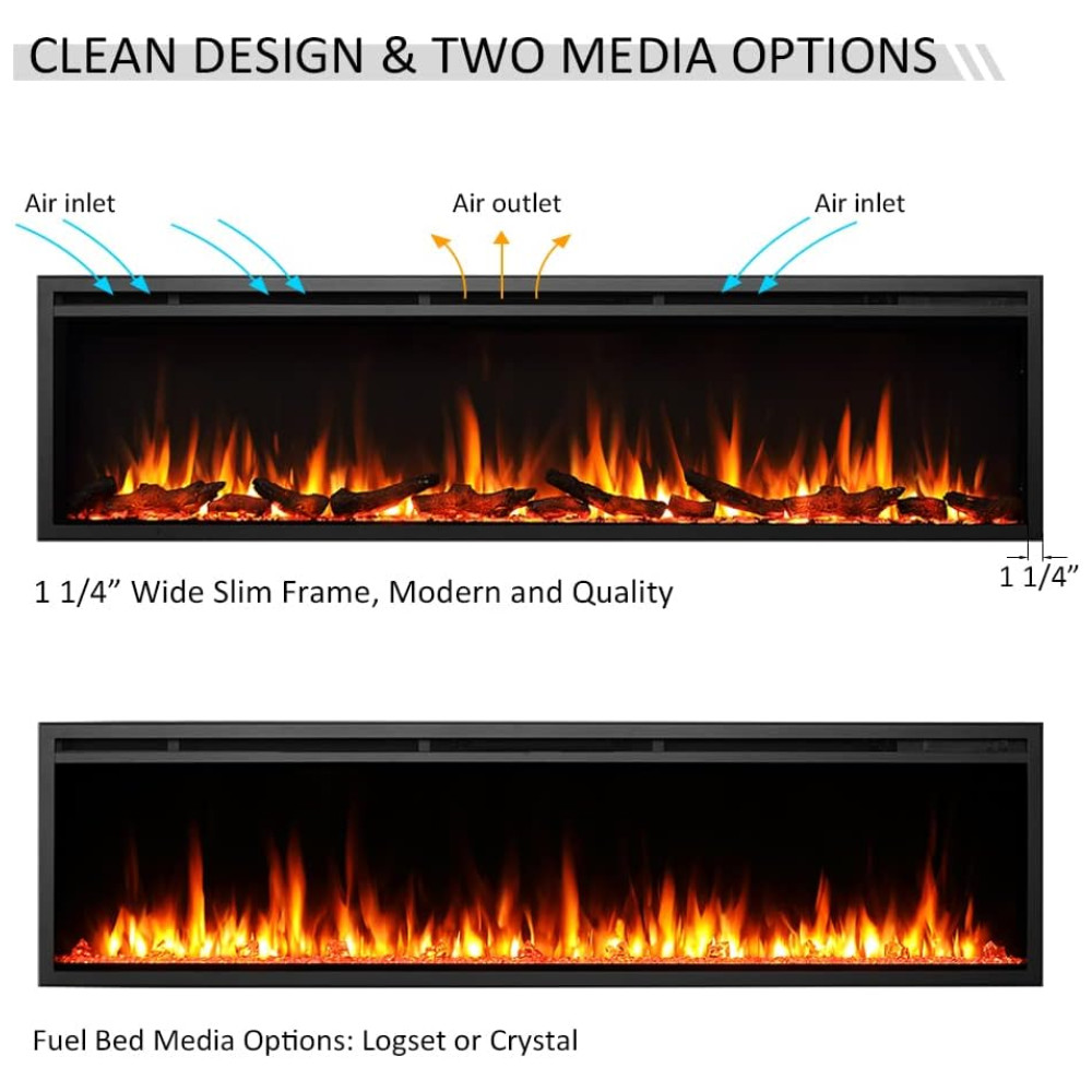 MULTI COMBINAÇÕES DE CHAMA A chama moderna e realista cria uma sensação de chama realista Incluindo as duas opções de leito de combustível conjunto de toras e pedra de cristal.