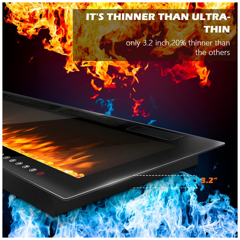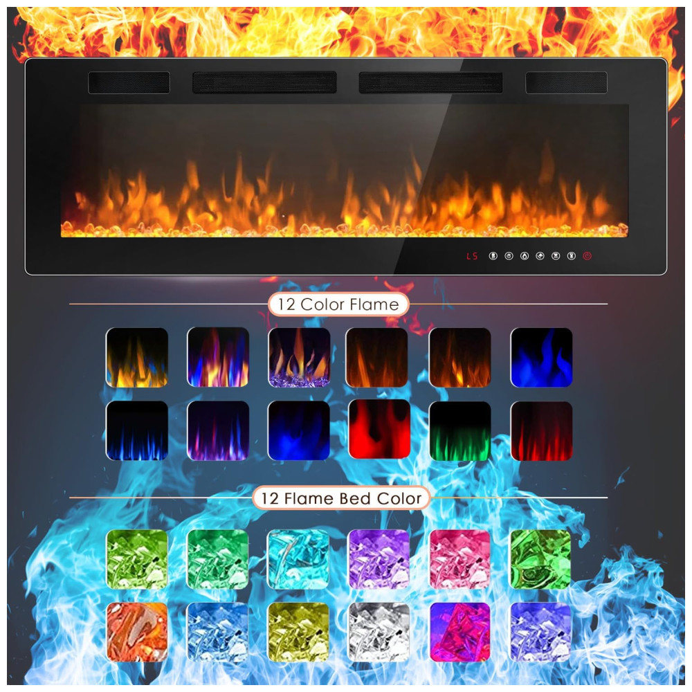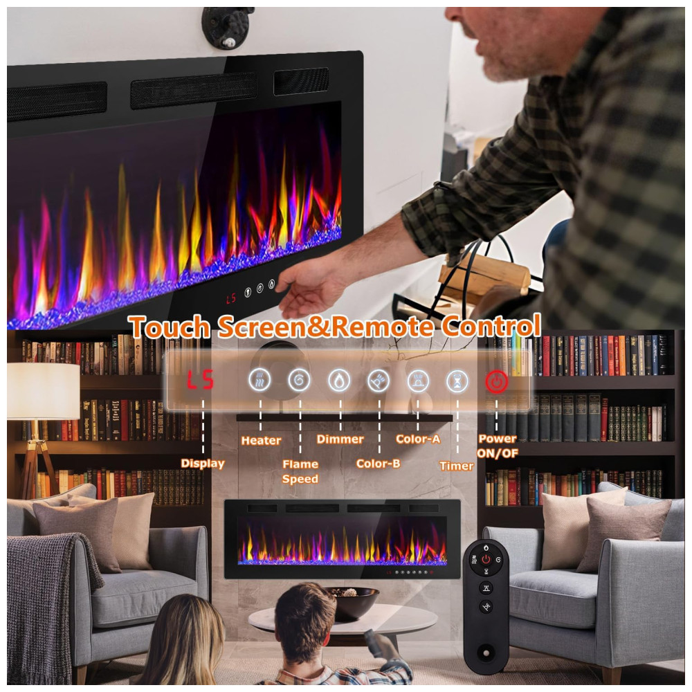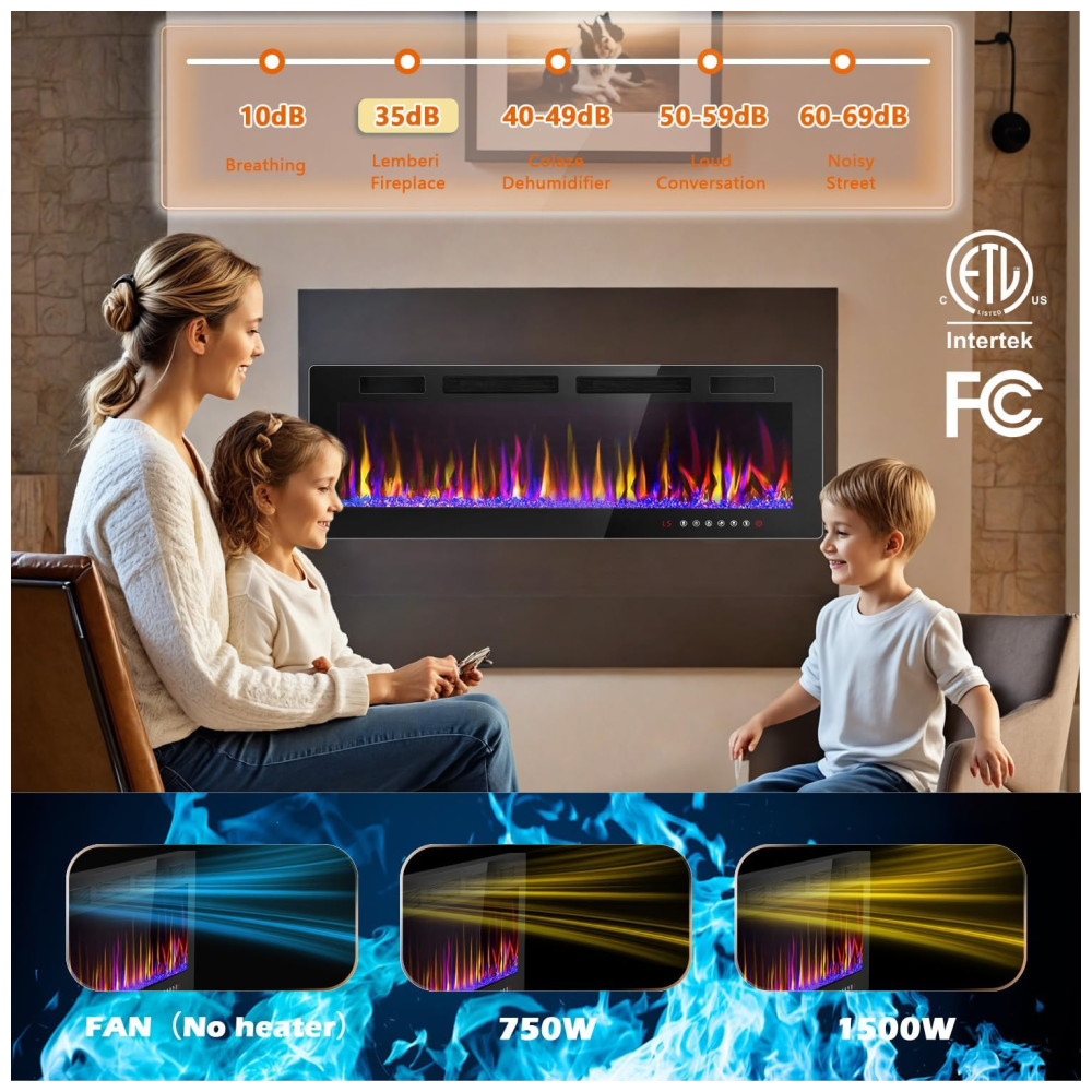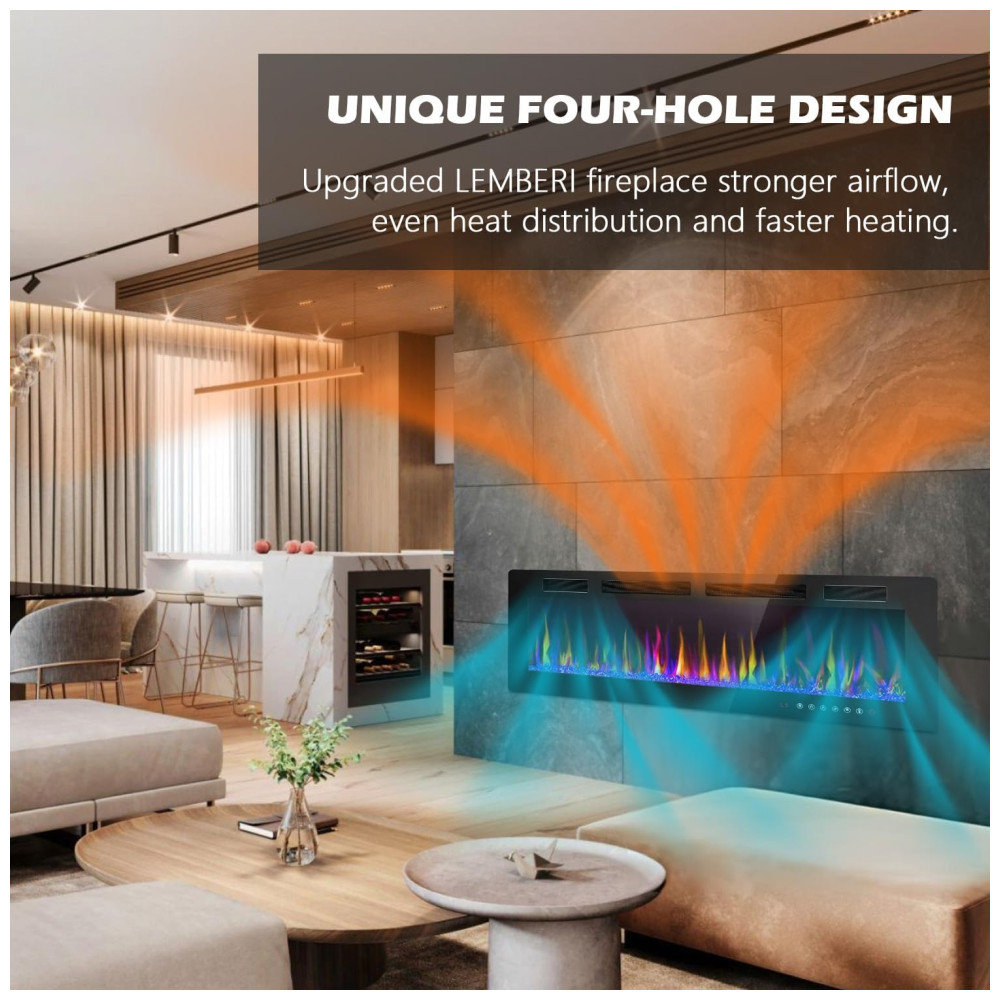 Lareira Elétrica de Embutir A45x182L com Controle Remoto e Temporizador, 110V 1500W, LEMBERI, Preta: Conheça a Lareira Elétrica LEMBERI de 182,8 cm Chama Atraente Há um botão para controlar a cor da chama e um botão para controlar a cor do leito de chamas.