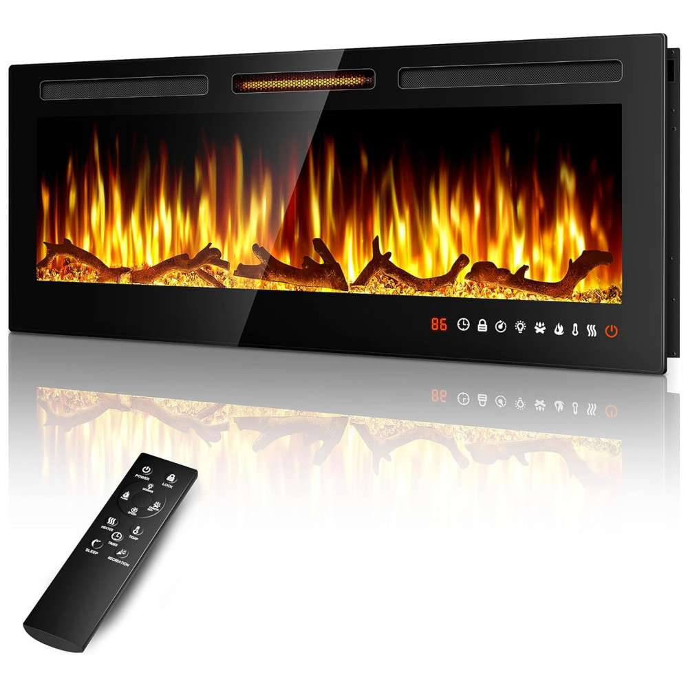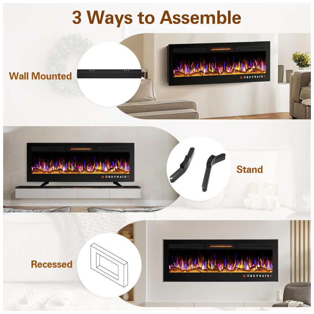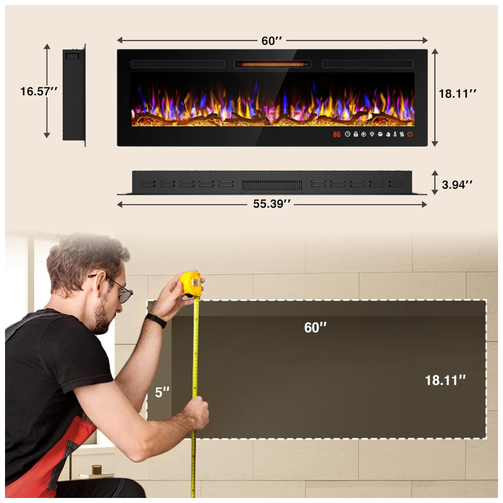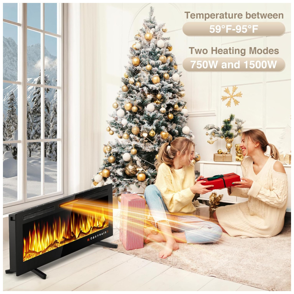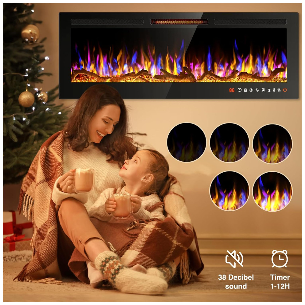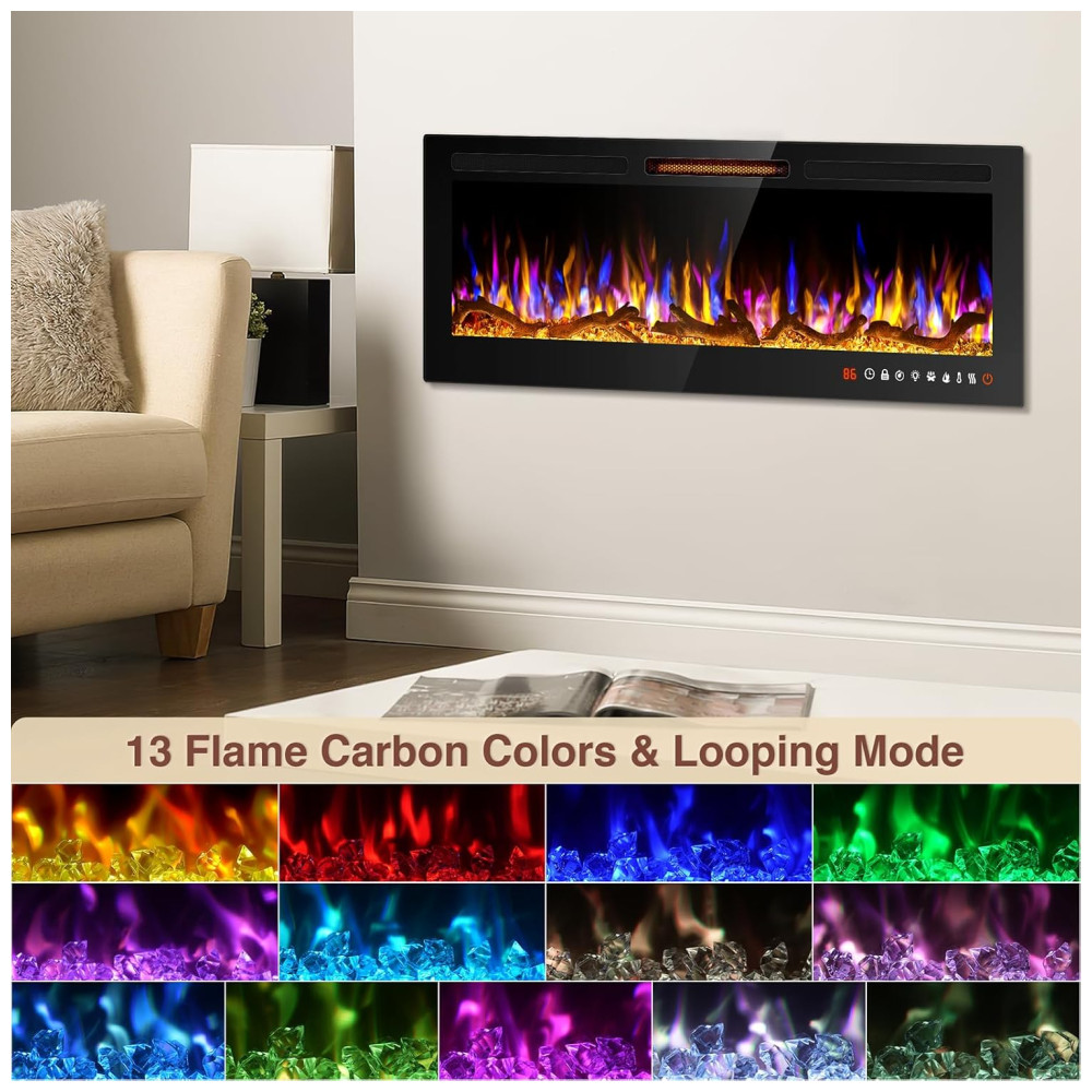 Lareira Elétrica de Embutir A46x152L cm com Controle Remoto, 13 Cores de Chama Ajustáveis e 5 Brilhos, 110V 1500W, Alpaca, Preta: Esta lareira de parede proporciona uma experiência visual impressionante com suas chamas realistas, disponíveis em 13 cores diferentes e um leito de carbono.