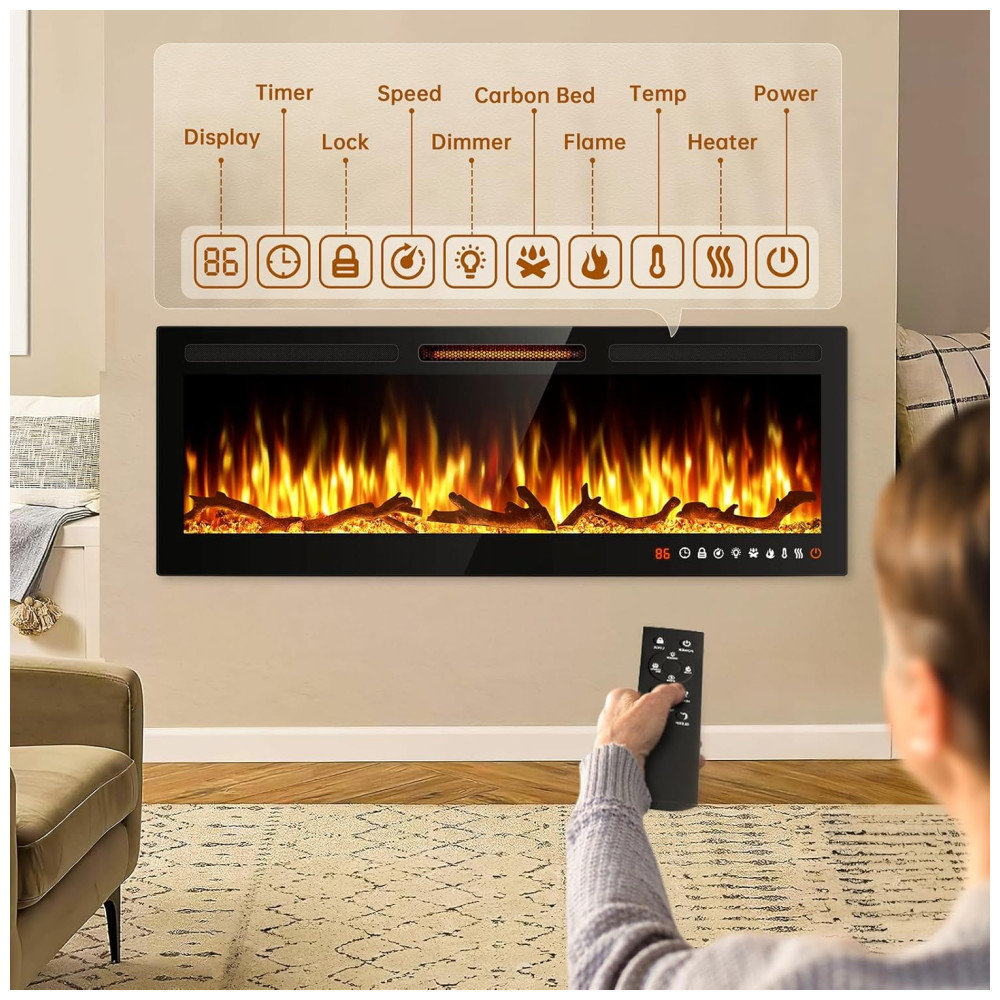 A operação da lareira é simplificada por um controle remoto multifuncional e um painel de controle sensível ao toque, permitindo ajustar facilmente diversas funções, como temporizador de 1 a 12 horas, interruptor independente de aquecimento e chama, brilho ajustável 5 níveis , 5 velocidades da chama e modo de espera e recreação.