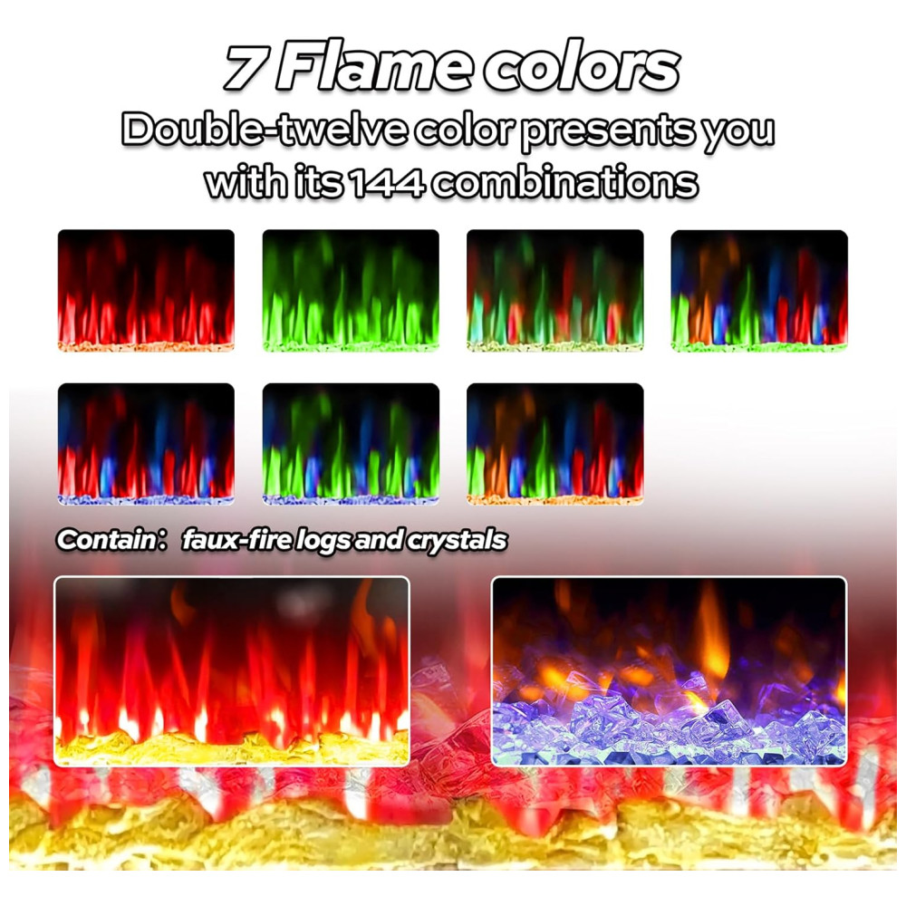 Chama realista A lareira inclui cristais e toras de fogo falso para criar uma sensação autêntica, bem como um controle remoto IR para controlar a cor e a intensidade da chama, o aquecedor e o temporizador de desligamento