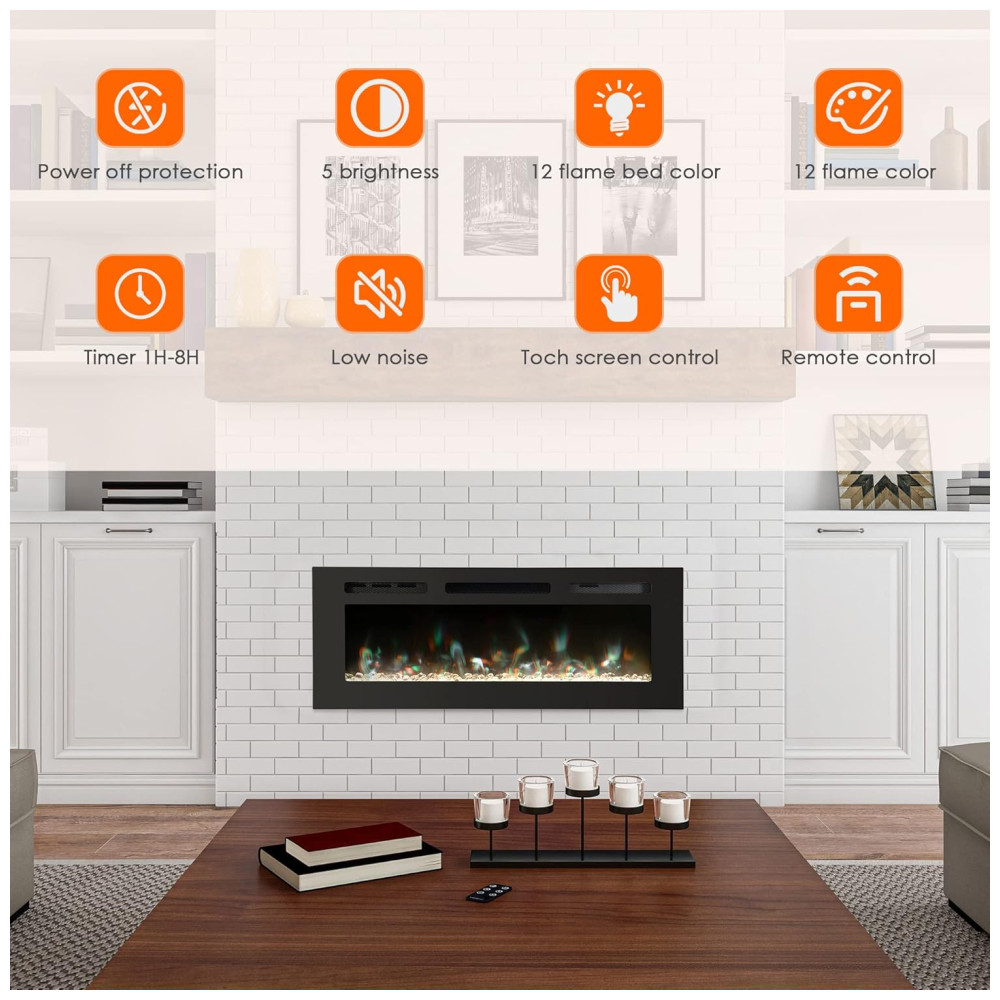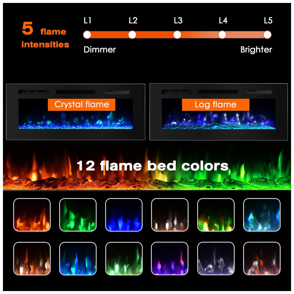 Efeitos de chama realistas A lareira elétrica simula um efeito de chama realista, fazendo você se sentir quente visualmente. 9 cores de chama podem ser alteradas e 5 brilhos de cha