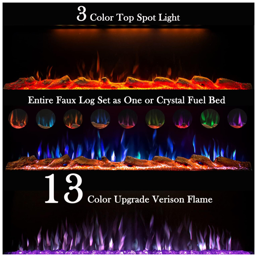 CHAMA REALISTA DE VÁRIAS CORES 13 cores de chama ajustáveis e 3 luzes superiores estão disponíveis para a lareira inteligente.