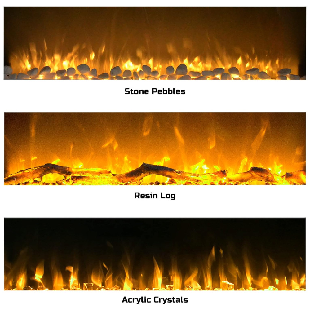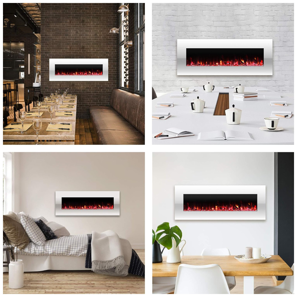 O aquecedor de lareira elétrica montado na parede também possui 10 opções de cores de chama para mudar instantaneamente o ambiente.