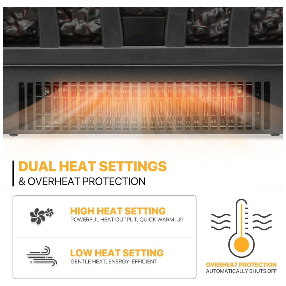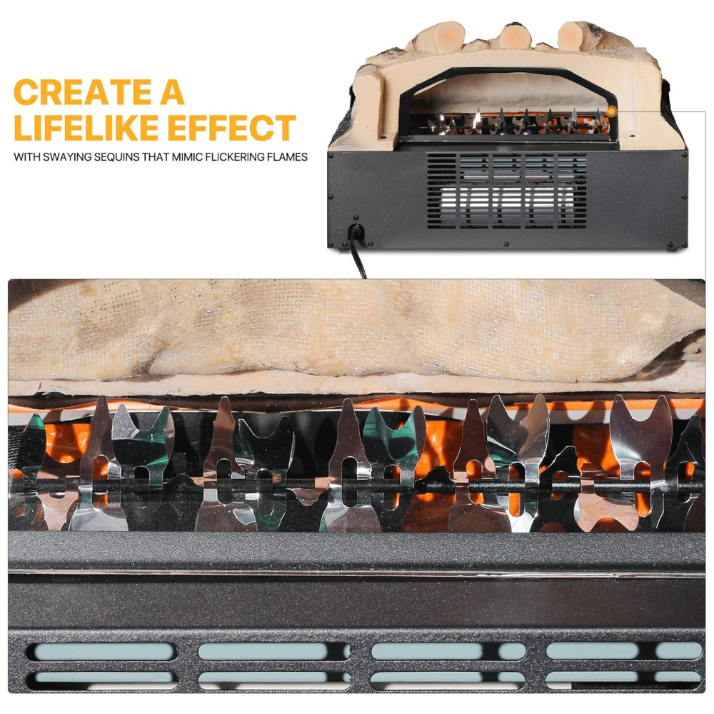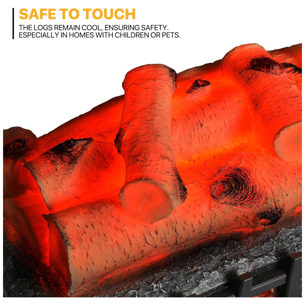 Aquecedor elétrico Vivid Flame com efeito de chama realista em 3D, projetado para simular uma lareira autêntica com toras meticulosamente trabalhadas e chamas vibrantes.