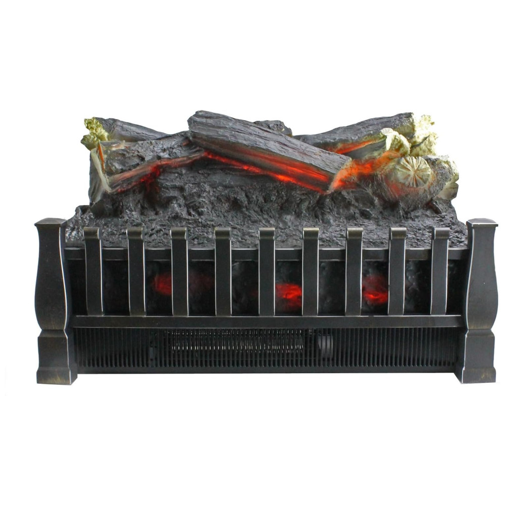 Este conjunto apresenta um conjunto de toras realistas sobre uma cama de brasas em uma grelha de fogo autêntica, projetando um efeito de chama ondulante na parte de trás da lareira, podendo funcionar com ou sem calor.