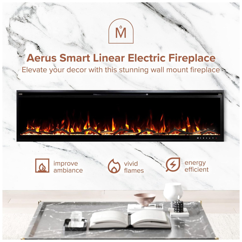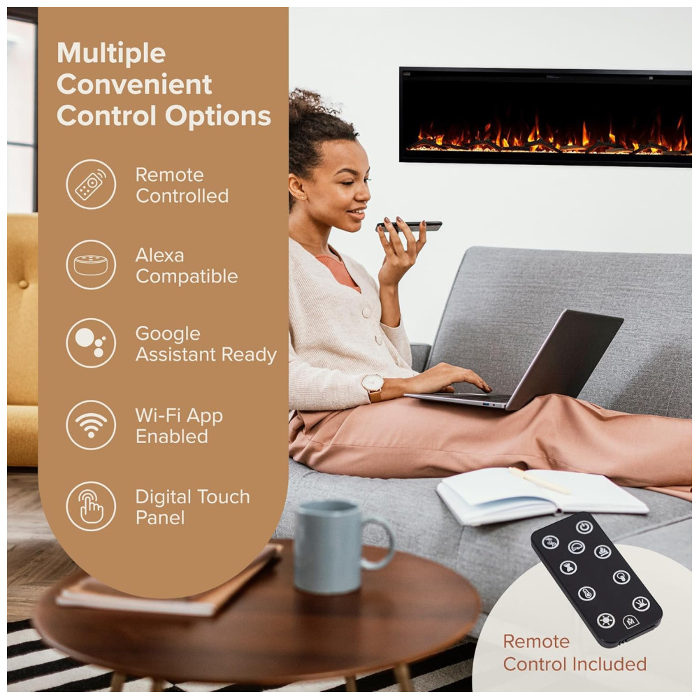 Lareira Elétrica Linear Inteligente Modern Ember Aerus de 183 cm, Embutida ou de Parede, Chamas LED Multicoloridas, Wi Fi, Alexa, Google