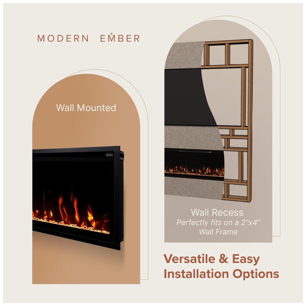 A Lareira Elétrica Linear Aerus Slim pode ser instalada de duas formas diretamente na parede ou embutida em uma parede com moldura de 2×4 para uma aparência nivelada. O contro