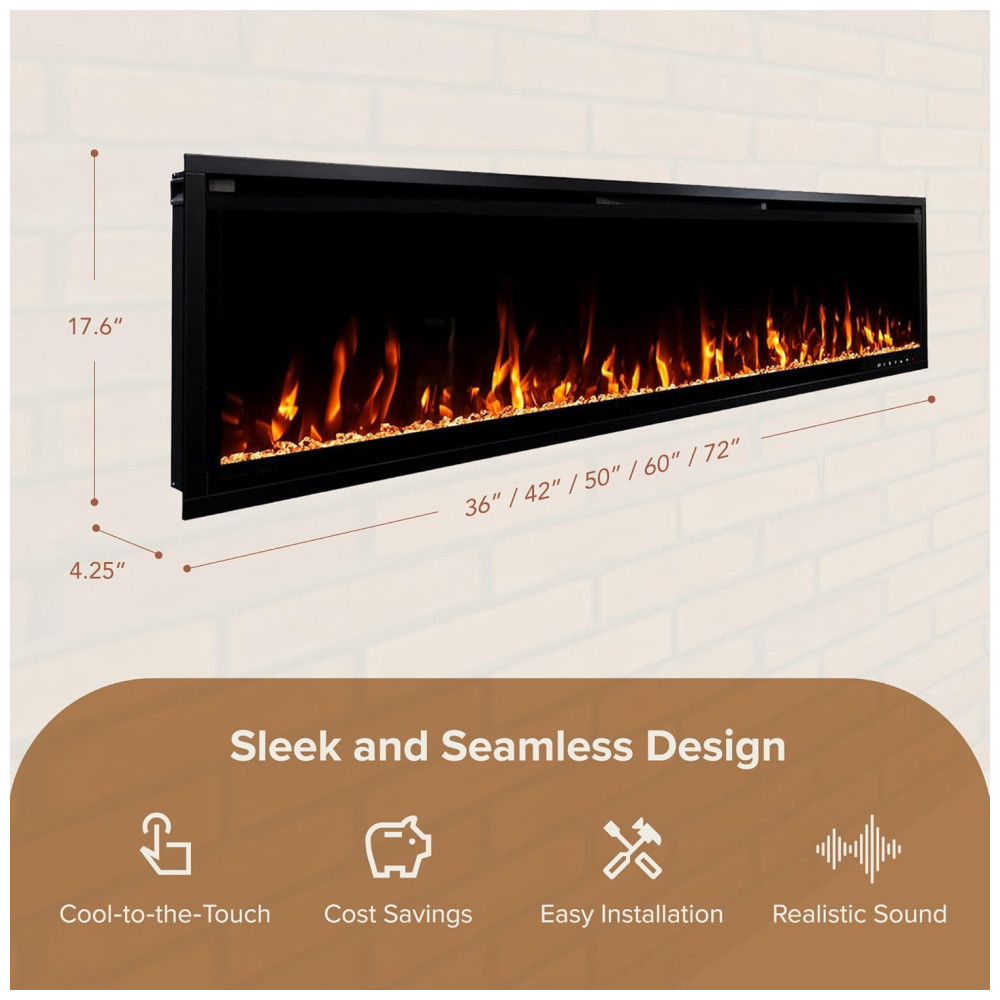 Lareira Elétrica Linear Inteligente Modern Ember Aerus de 183 cm, Embutida ou de Parede, Chamas LED Multicoloridas, Wi Fi, Alexa, Google: A Lareira Elétrica Linear Aerus Slim pode ser instalada de duas formas diretamente na parede ou embutida em uma parede com moldura de 2×4 para uma aparência nivelada.