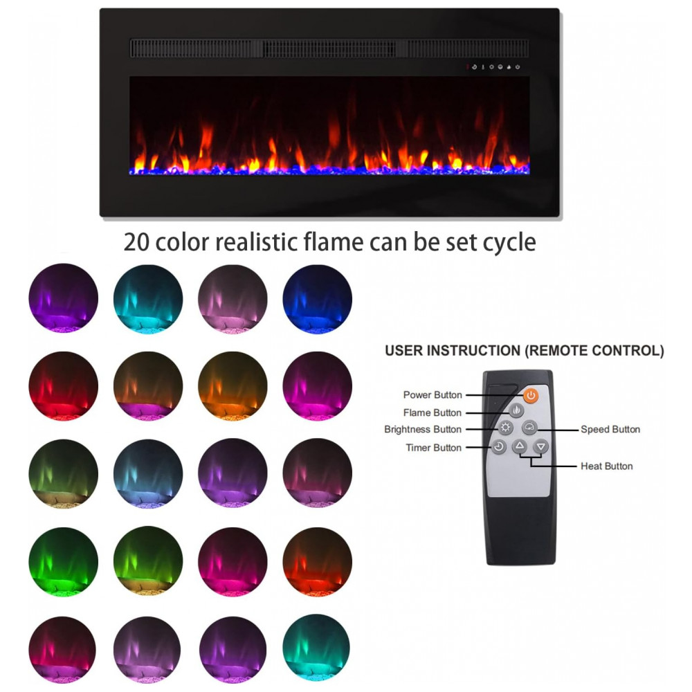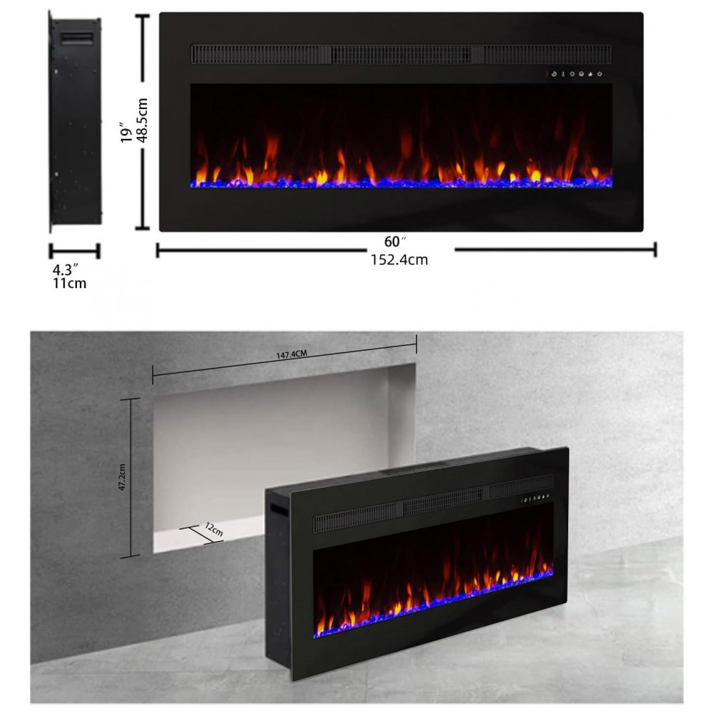Lareira Elétrica Panana de 152 cm, Embutida ou de Parede, com Timer, LED Touch, Controle Remoto, Chamas Ajustáveis em Cor e Velocidade: Esta lareira elétrica versátil está disponível e pode ser montada na parede ou inserida, oferecendo opções flexíveis de instalação para se adequar a qualquer espaço.