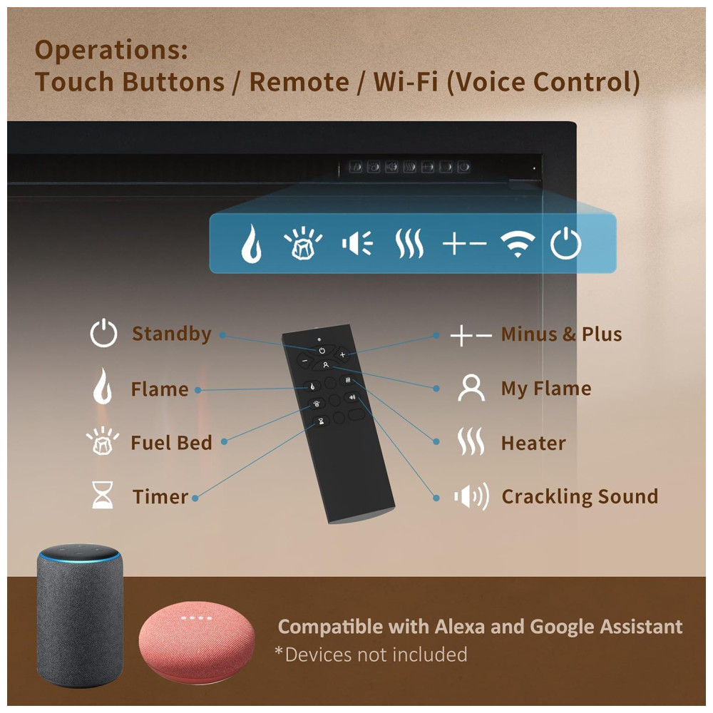 Possui 9 cores de chama e leito de combustível, som de estalo com brilho ou volume ajustáveis, madeira flutuante e cristais incluídos, permitindo que você tenha a liberdade de mudar a aparência da sua lareira para se adequar ao seu estilo e necessidades.